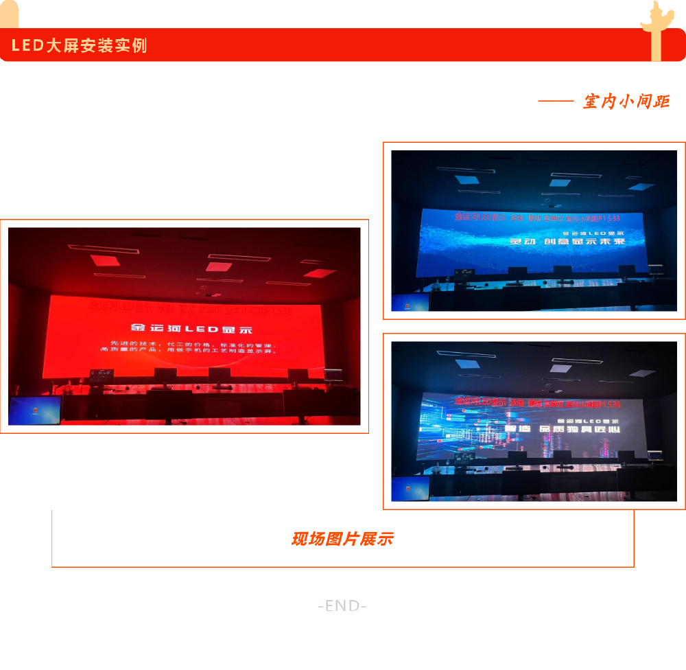 1.對比度非常高,白平衡一致,顯示色彩均勻,畫面清晰度高,能滿足現場直播的要求;2.超高刷新頻率,完全杜絕掃描線出現,滿足舞臺拍攝的需要,呈現完美效果。
